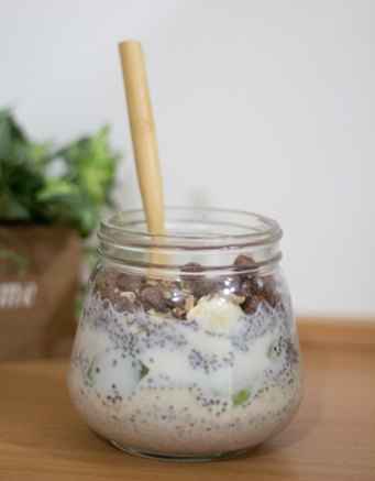 把一份燕麦片,Chia Seeds,水果放入有盖玻璃瓶。倒入牛奶/豆奶刚好覆盖所有食材。盖上放入冰箱,第二天早上就有营养早餐了。如果不适应一早吃冷冻食物,可以先拿出来放在一旁,稍微回温了才吃。